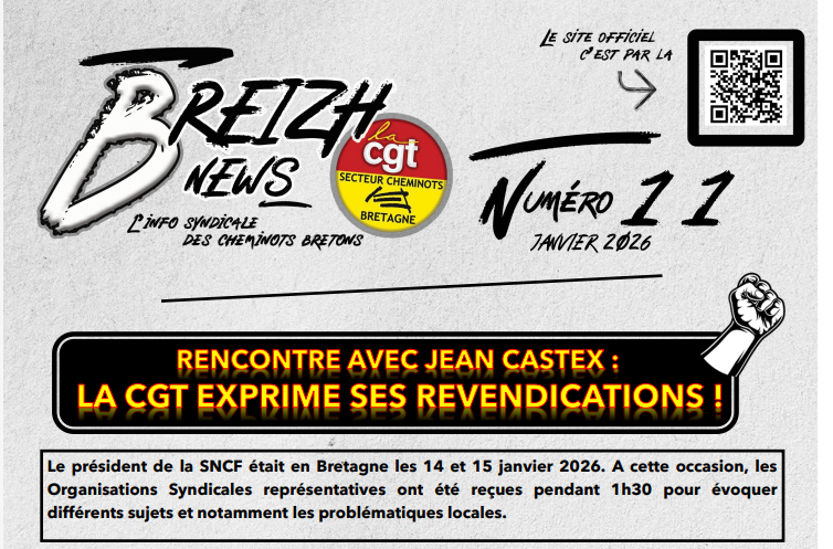 Comme chaque mois, la CGT Cheminots Bretagne propose l’actualité syndicale des cheminots bretons avec le Breizh’News. Pour ce mois de Janvier 2026, voici votre édition n°11 du Breizh’News, à découvrir et à imprimer, partager dans vos chantiers !