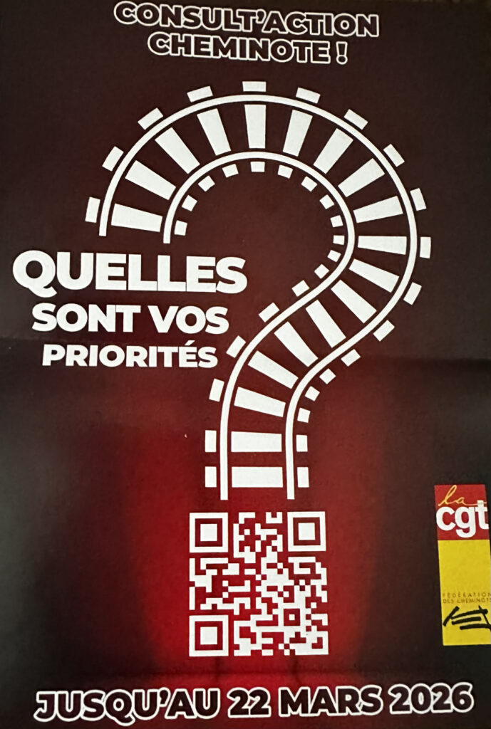 Jusqu’au 22 Mars 2026, la CGT Cheminots invite l’ensemble des cheminot-es à répondre à la « Consult’action » et à donner leurs priorités.