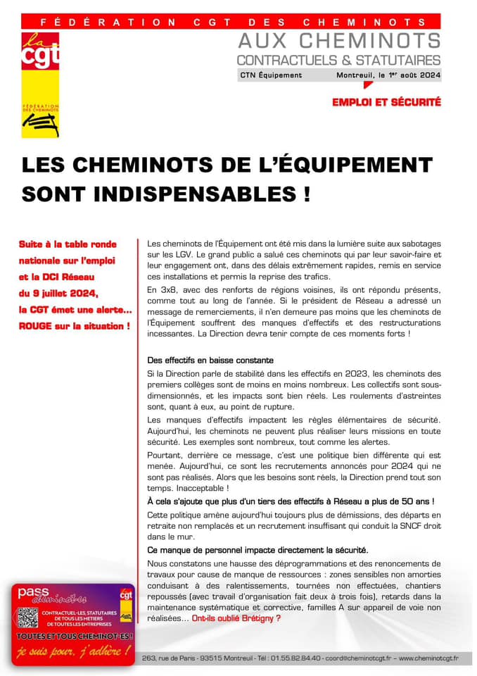 Malgré les sabotages, malgré l’engagement de nos camarades, la table ronde nationale sur l’emploi et la DCI Réseau du 9 juillet 2024 n’a pas porté ses fruits. Une fois de plus, la CGT émet une alerte… Rouge sur la situation.