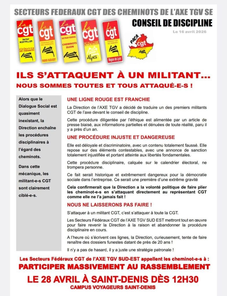Récemment c’est la Direction de l’AXE TGV qui a décidé de traduire un des premiers militants CGT de l’axe devant le conseil de discipline. Cette procédure diligentée par l’éthique est alimentée par un article de presse biaisé, aux informations partielles et dénuées de toute réalité, paru il y’a près d’un an.
