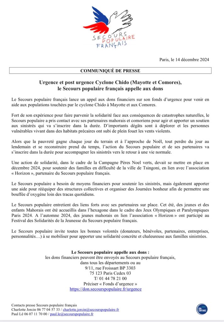 Nous invitons bien évidemment les camarades et tout les citoyens à faire preuve de générosité dans cette période difficile que cela soit pour Mayotte, pour les inondations en Espagne ou encore pour le Liban.