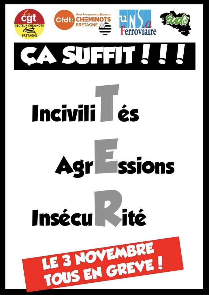 Depuis des mois maintenant, la situation est devenue totalement incontrôlable en gare et dans les trains bretons. La Direction TER Bretagne ainsi que Gares et Connexion ne souhaite pas assumer leurs responsabilités et dans ce cadre nous n’avons plus le choix. Le mot d’ordre pour le 3 Novembre est clair : Aucun train ne doit circuler, Aucun agent ne doit être sur le terrain !